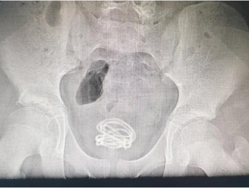 术后,小何向医生回忆,三个月前的一次小便时,他产生了疑问:尿液是来自哪里?尿道通向什么地方?于是便拿起身边的塑料电线一探究竟,伴随着痛痒及愉悦的感觉,70厘米的电线慢慢被塞了进去,塞进去容易取出来难,当发现电线因肌肉收缩拔不出来的时候,为时已晚。
