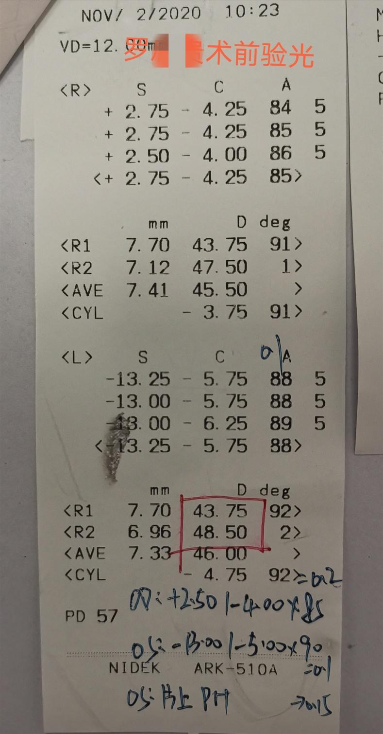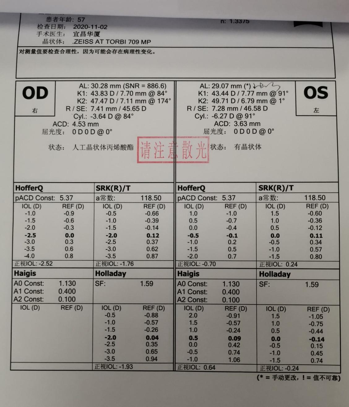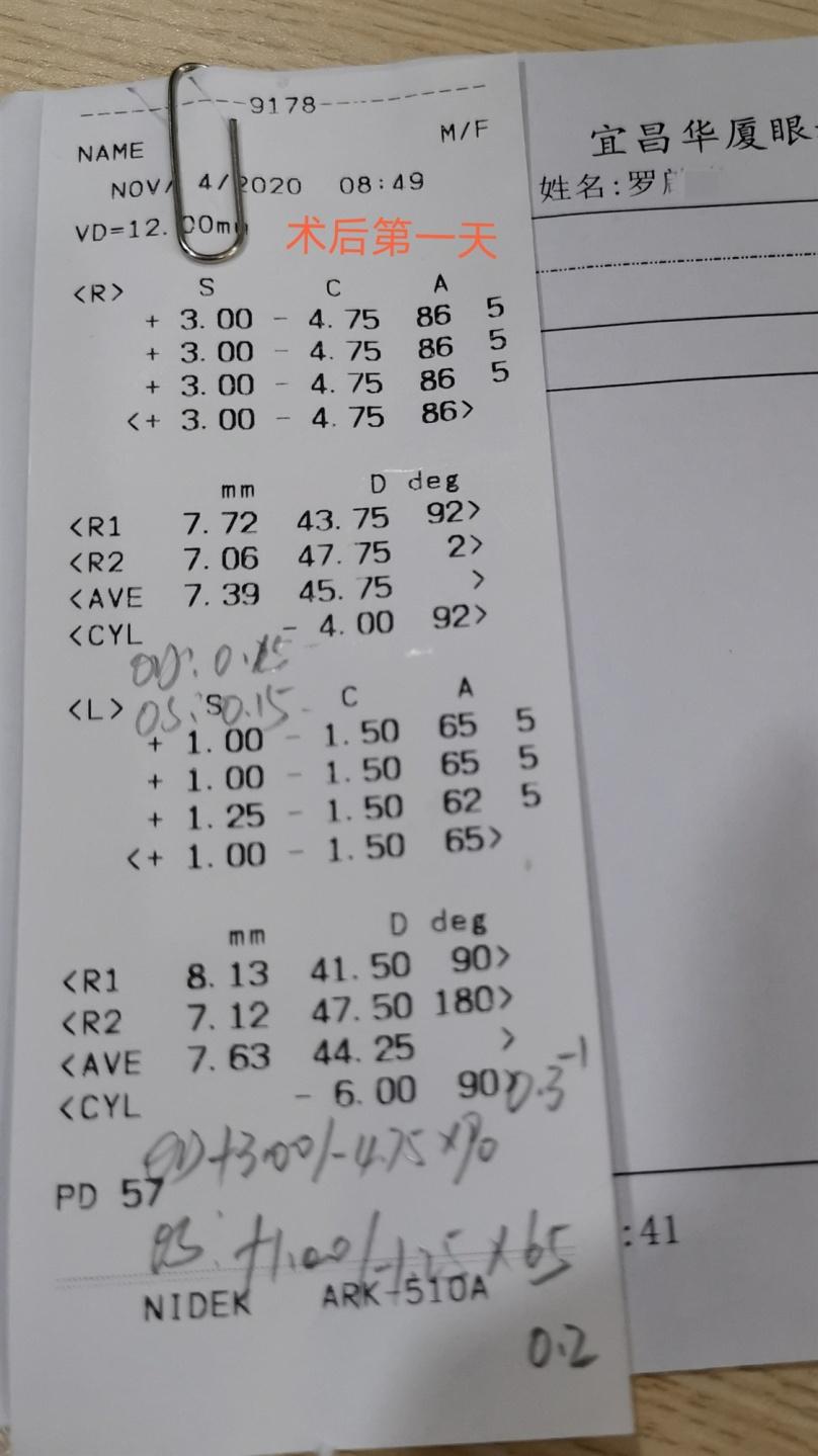2020年11月3日,宜昌华厦眼科医院院长许大玲带领团队成功为一名57岁的白内障高度近视加高度散光患者罗先生植入蔡司高达8D的三焦点晶体,术后第一天验光,散光除了预留度数全部消除,右眼由于几年前做了白内障没有植入晶体,患者术后非常满意,准备后期再来做第二只眼睛。