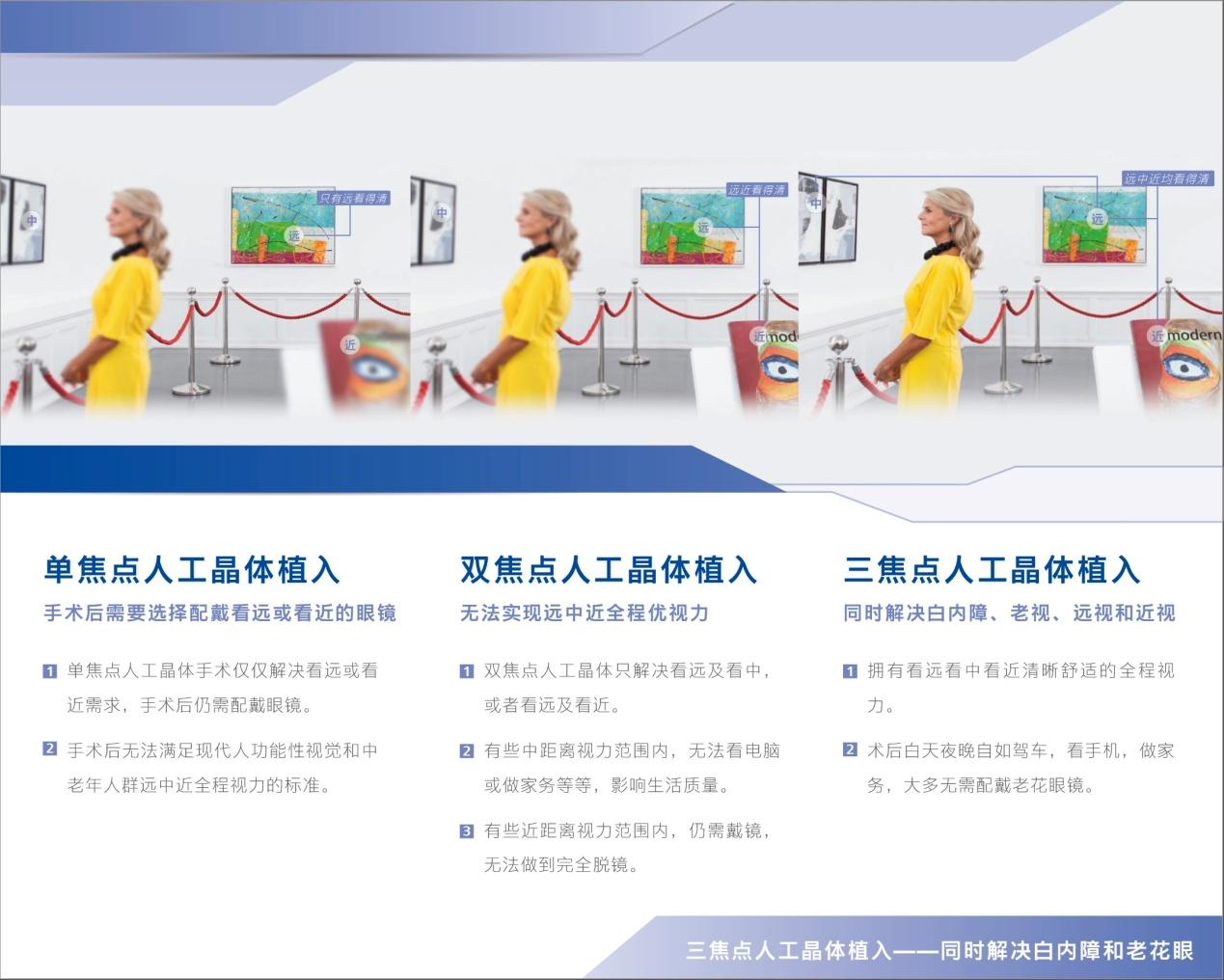 “非球面散光矫正型三焦人工晶体”整合了可折叠、非球面、多焦点和矫正散光四种技术,是目前先进的人工晶体之一。在解决散光矫正的同时,远、中、近全程距离都能获取良好视力,术后患者看远距离的风景、中距离的报纸和近距离的手机信息疗效均较好。