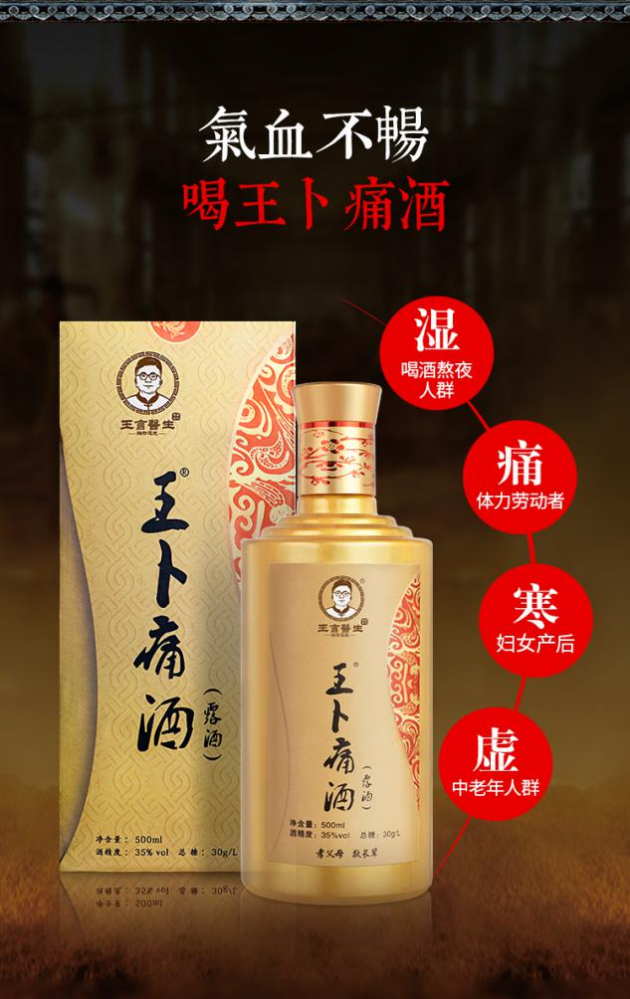旗下的养生酒王卜痛酒专治气血不畅,无论是喝酒熬夜人群,体力劳动者,妇女产后还是中老人人群,喝王卜痛酒,就能养气活血,因为涵盖人群广,所以已经问世就受到消费者的热捧。