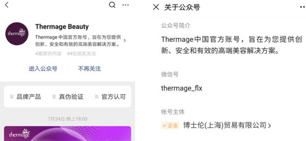 验证结果会通过消息的形式即刻发送到公众号内。需要注意的是,热玛吉官方微信公众号目前只有一个,公众号账号主体是博士伦公司,其他一些即便是通过腾讯认证的企业,也并非热玛吉官方微信公众号。