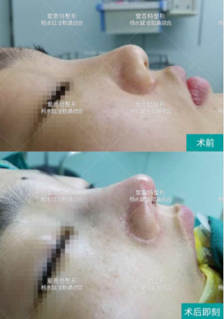 这位顾客是来找杨院长做隆鼻修复手术,第一次做的假体隆鼻,结果鼻尖萎缩露鼻孔,伴随鼻翼缘退缩。双方面诊沟通后,杨院长给她制定了全肋鼻修复手术方案。术后改善形态精致、力挺,鼻型得到了有些矫正和改善。