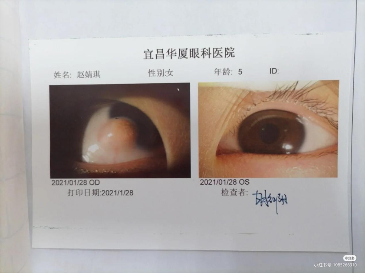 患儿赵某右眼表长肿物5年余,才五岁的一个小朋友。随年龄增长肿物不断变大,伴视物时重影及视力逐渐下降,视远近物均不清,无眼红,眼胀,眼痛,无流泪,异物感,未就诊及治疗,近期发现右眼视力下降明显,影响日常生活。1.28日就诊于宜昌华厦眼科医院,门诊检查后以右眼皮样囊肿,右眼角膜良性肿瘤收入院。