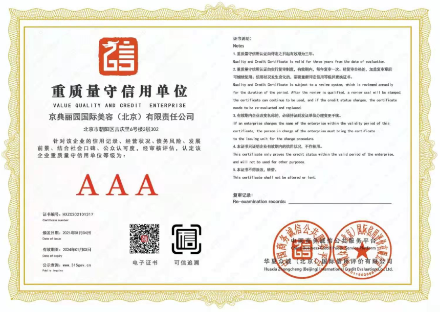 本次获奖是相关单位对于京典丽园多年以来诚信经营的鼓励,京典丽园自成立以来,积极参与社会信用体系建设,企业信用意识强,获得了在社会上良好的信誉和口碑。京典丽园不开刀去眼袋技术已成为众多求美者的信赖首选,行业口碑领先,备受不同年龄段求美者认可和好评。此外,京典丽园还以“面部抗衰”“科技抗衰面部提升”为核心,在安全性、舒适度、精细化等多维度深耕,致力于打造中国专注眼部年轻化直营分级连锁品牌机构。目前已向国家申请不开刀祛眼袋发明专利,眼部抗衰专利等2项国家发明专利,8项实用新型眼部,抗衰等技术专利。京典丽园品牌将以“AAA级企业资信等级认证”为基础,脚踏实地,砥砺前行,打造中国眼部整形年轻化基地,为求美者提供更加专业的年轻化体验。