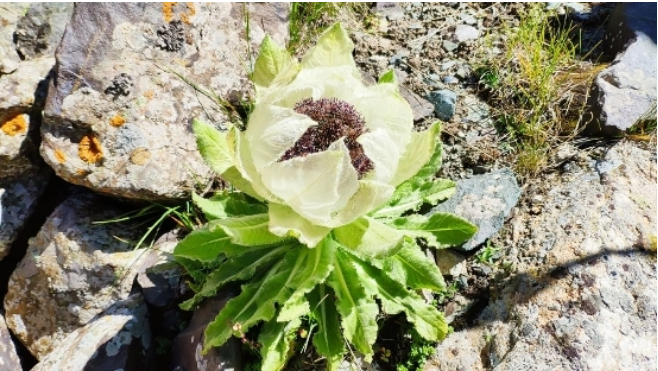 医学百科记载。天山雪莲,又名“雪荷花”,当地维吾尔语称其为“塔格依力斯”。属菊科凤毛菊,属多年生草本植物。新疆特有的珍奇名贵中草药;生长于天山山脉海拔4000米左右的悬崖陡壁之上、冰渍岩缝之中;那里气候奇寒、终年积雪不化,一般植物根本无法生存,而雪莲却能在零下几十度的严寒中和空气稀薄的缺氧环境中傲霜斗雪、顽强生长。这种独有的生存习性和独特的生长环境使其天然而稀有,并造就了它独特的药理作用和神奇的药用价值,人们奉雪莲为“百草之王”、“药中极品”。