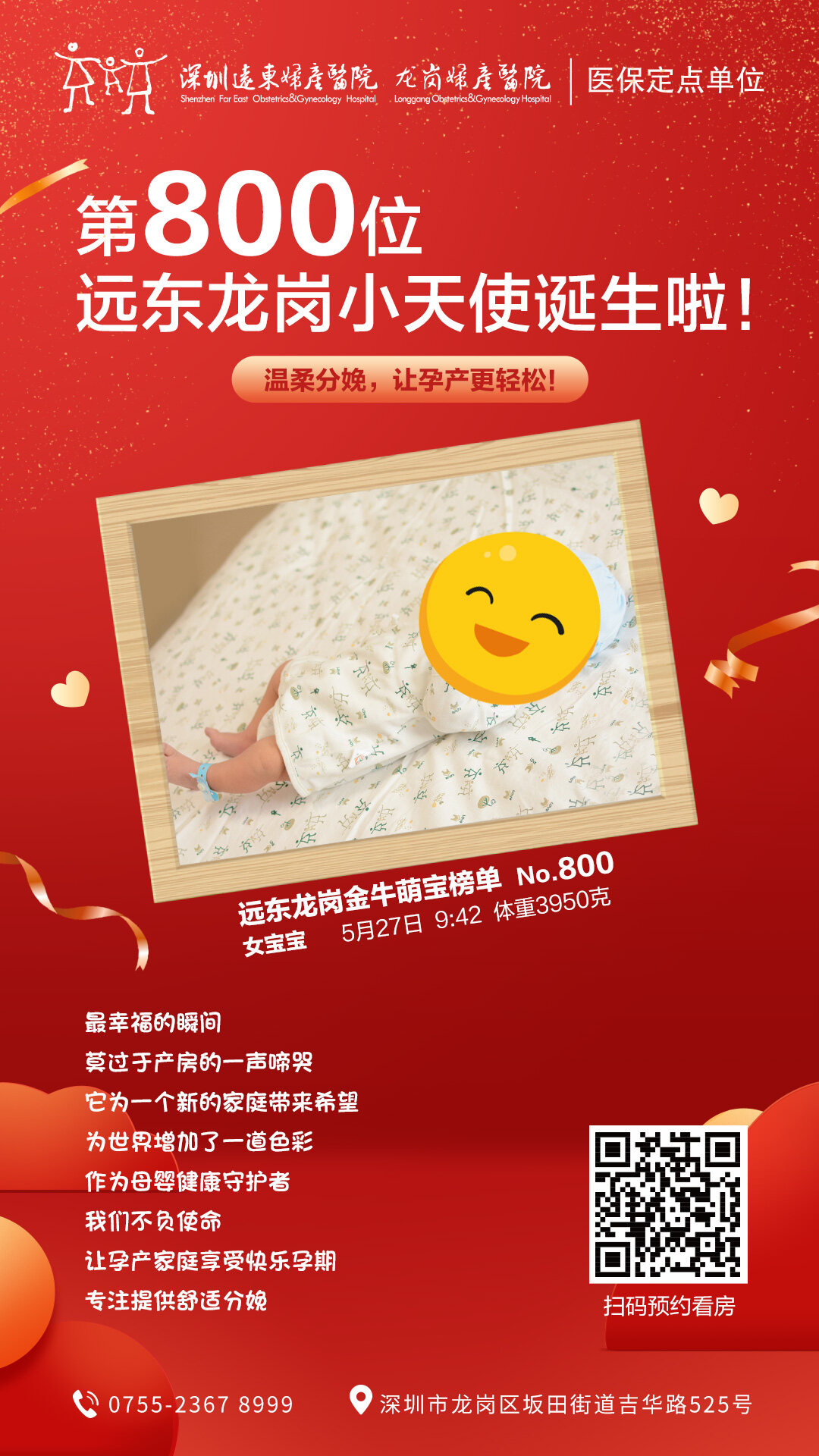 就在今天,远东龙岗第800位宝宝诞生,这位宝宝带着对5月浓浓的爱降临,是对远东龙岗产科服务认可,也是对优化升级的孕产2.0的支持。