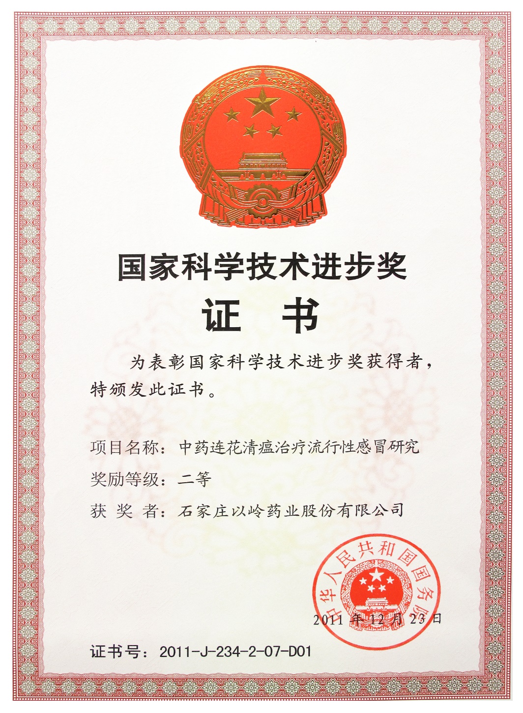 2012年2月14日,由以岭药业完成的“中药连花清瘟治疗流行性感冒研究”项目荣获2011年度国家科技进步二等奖。国家科技进步奖是国务院设立的,连花清瘟获此大奖,表明临床疗效的卓越,彰显了创新中药的科技生命力。