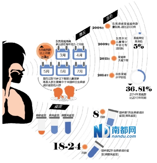 记者了解到,2008年东莞麻疹发病病例数量较高,超过2000例。自2009年开始,东莞连续两年针对儿童青少年进行麻疹强化免疫行动。麻疹发病数随后大幅下降。至2011年控制效果非常明显,麻疹发病已不足百例,发病率只有原来5%,下降幅度达到了20倍。现在,麻疹总体在相对较低发病水平,今年发病数与去年同期相比下降36 .81%。不过,市疾控中心表示,由于东莞人口流动具有量大、频次高、季节性强,可能存在一定的免疫空白人群,并且麻疹疫情输入风险较高,所以局部地区集体单位内存在出现聚集性病例的风险。