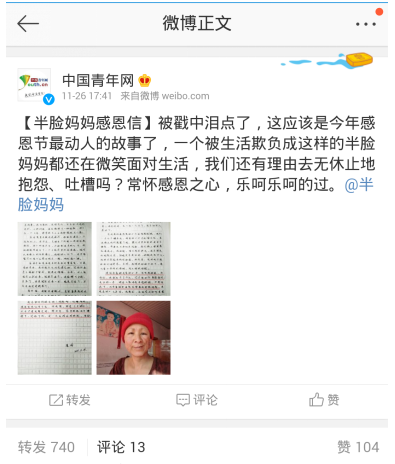 今年感恩节期间,董玲写了一封感恩信,披露了自己的遭遇和感悟,并发布在自己名为“@半脸妈妈”的微博上。随后,这封充满了坚强、乐观、感恩精神的信,迅速引起了网友的关注而走红网络,浏览量达到了数千万次,获网友转发过万次、评论过千次,并一度成为新浪微博热门话题,被网友评为“今年感恩节最催泪的故事”。