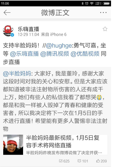 半脸妈妈董玲称,自己之所以选择对这次复容手术进行网络直播,第一个方面是因为她得知全国有超过100万的非法注射物受害者,很多人不仅美容失败,而且还造成了极大的心理障碍,甚至不少人选择了自杀,所以她希望通过直播来鼓励非法注射物受害者,进行有效的治疗,不要一辈子活在美容失败的阴影里。其次,她是在不知情的情况下被注射奥美定导致毁容,因此,她也希望自己的这次手术直播能推动医疗美容手术透明化,希望医疗美容市场能实现全面规范化的操作。