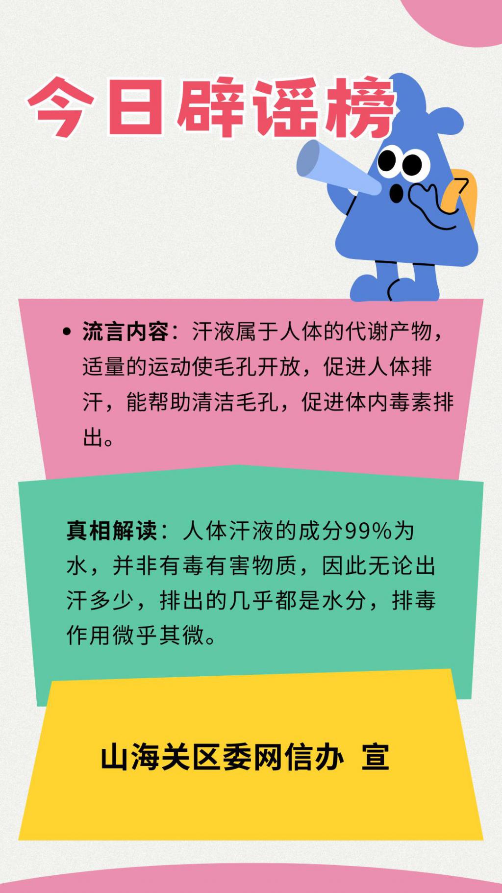 3月5日消息,近日,网传“运动时出汗意味着是在排毒”?对此,网信山海关辟谣,称人体出的汗99%都是水,并非有毒物质,排毒作用微乎其微。