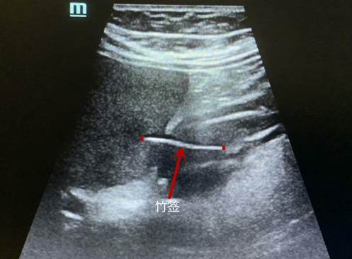 超声科谭庆亭医师反复检测,在患者的胃窦处发现了一个细细长长的异物,经张华斌主任当场会诊后,明确了诊断。此时,患者才努力地回想起,自己发病的前一天曾用竹签吃过包子。超声检查发现这根竹签已经刺破了胃壁,扎入了肝脏。“胃镜没发现是因为这根竹签的位置很特殊,它穿出了黏膜层,位于黏膜下。”超声科主任张华斌解释说。