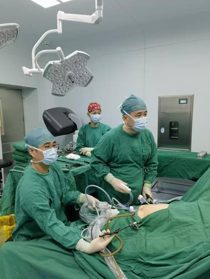 王鹏飞医师(右一)腹腔镜下手术取出竹签(图片由清华长庚医院提供)