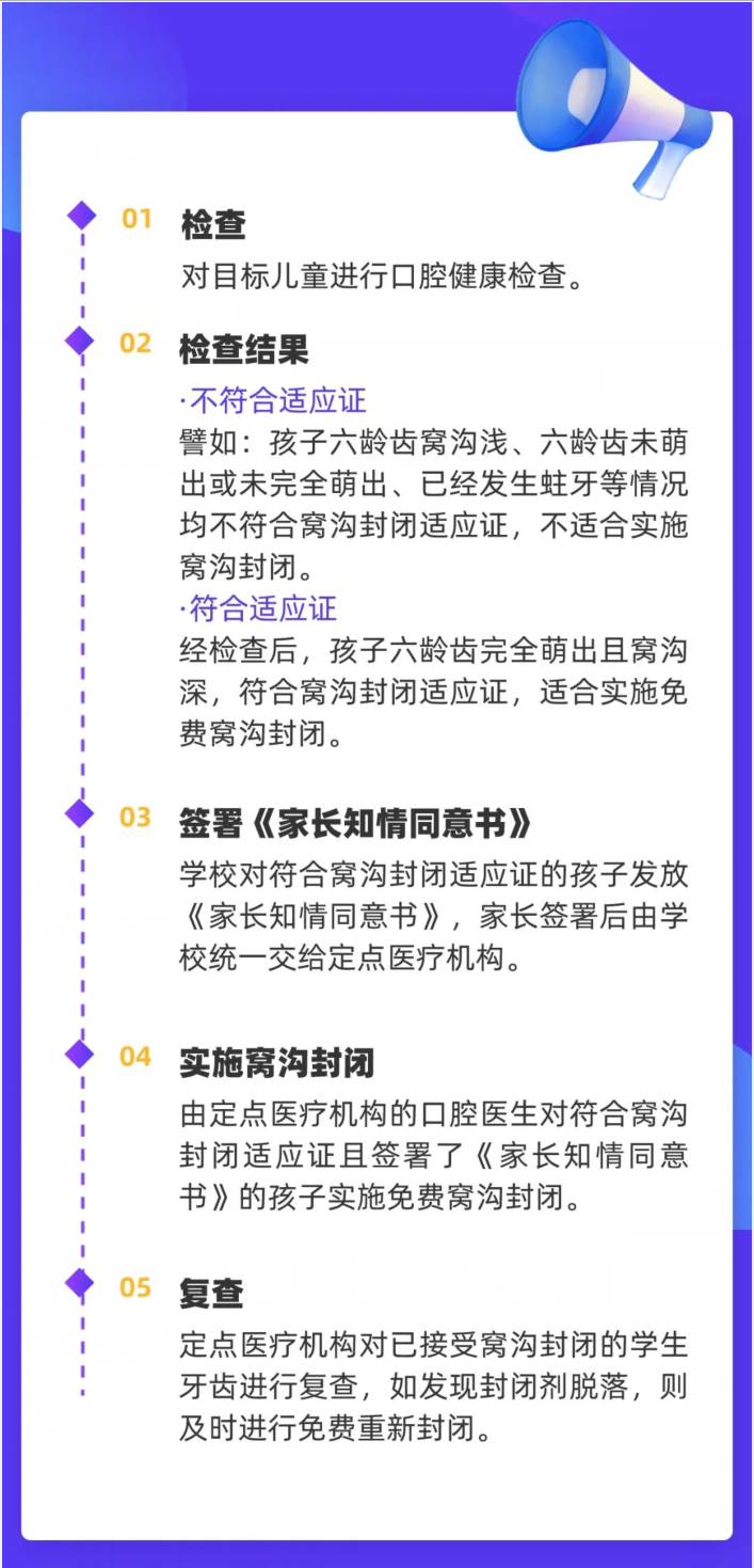 2.服务程序:根据相关文件精神,我市幼儿园儿童实施免费局部涂氟工作由各镇街(园区)逐步自行开展。我市免费牙齿涂氟和窝沟封闭的服务形式有三种:一是由定点医疗机构入校为学生服务;二是由家长凭定点医疗机构开的口腔健康处方自行带学生到定点医疗机构接受服务;三是由镇街(园区)项目办统筹,学生统一乘坐校车到定点医疗接受服务。