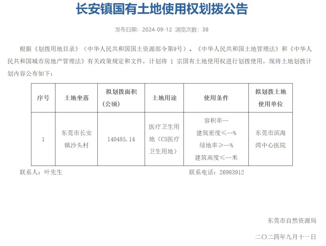 近日,东莞市自然资源局发布公告将长安镇沙头社区约14.0485公顷划给东莞市滨海湾中心医院,这也意味着 项目已经正式供地,距离动工建设又前进一大步。