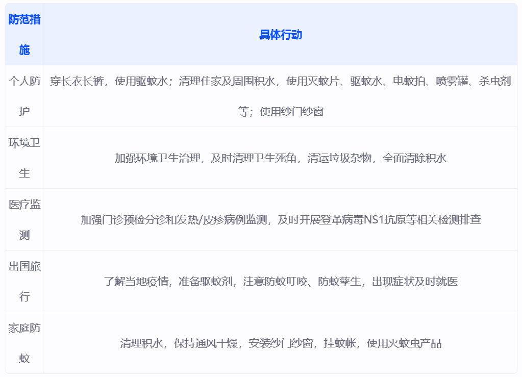 个人防护:外出时建议穿长衣长裤,并使用驱蚊水;保持居住环境整洁,清理积水以防蚊虫孳生;家中应使用纱门纱窗,并配备灭蚊片、电蚊拍等防蚊工具。