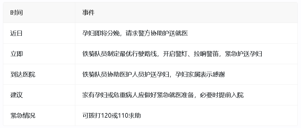 到达医院后,铁骑队员协助医护人员护送孕妇,孕妇家属对铁骑队员的迅速反应和热心救助表示衷心感谢。