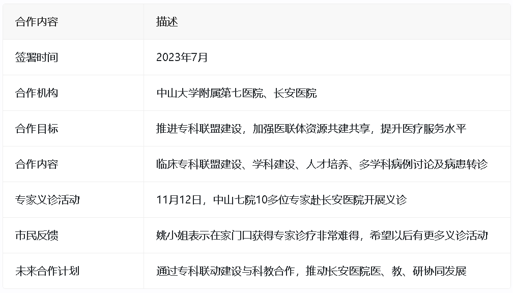 表格:中山大学附属第七医院与长安医院合作概览