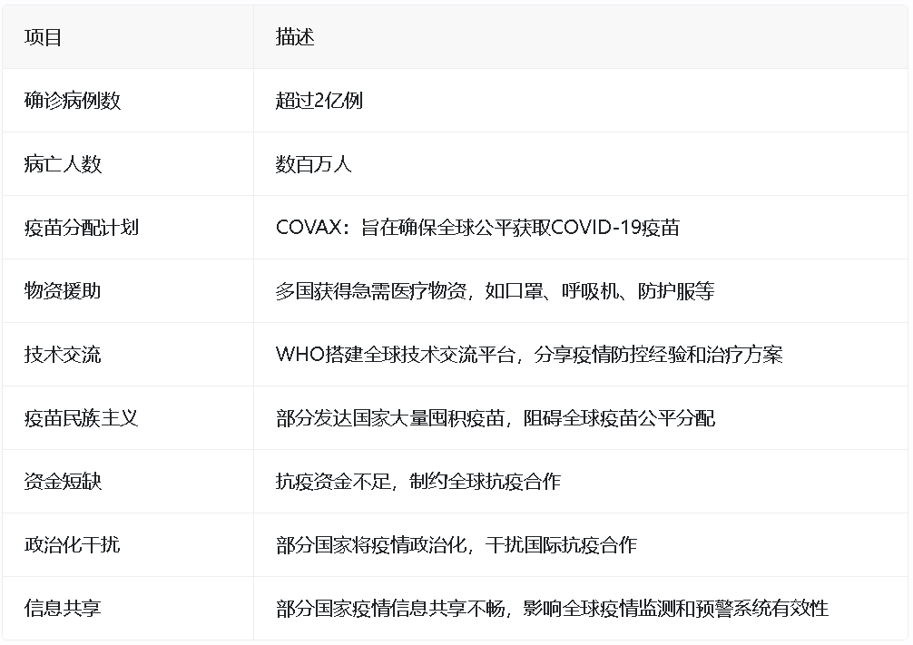 - WHO的作用:作为全球公共卫生领域的领导机构,WHO在疫情监测、信息共享、政策指导等方面发挥了重要作用。然而,WHO也面临着资金不足和政治化干扰等问题,其职能的发挥受到了一定限制。