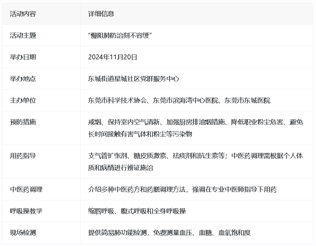 通过此次科普活动,东莞市科学技术协会、滨海湾中心医院和东城医院共同为社区居民提供了一次宝贵的学习机会,增强了居民对慢阻肺防治的意识与能力,有助于构建更加健康的社区环境。