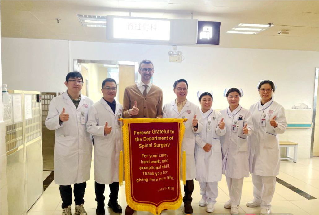 东莞市人民医院脊柱骨科近日收到了一面特殊的锦旗,这面锦旗来自一位在东莞生活了超过十年的波兰友人Jakub。锦旗上用中英双语写着“感谢你们带给我新生活”,以表达他对医护团队的感激之情。Jakub患有先天性下腰椎畸形侧弯和滑脱,此前在国外已接受过三次手术,但问题仍未彻底解决。对东莞医疗充满信任的他,选择在东莞市人民医院进行再次手术。