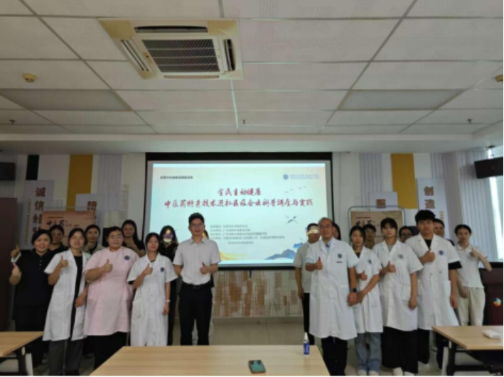 麦粉的粉尘在阳光中浮沉,中粮(东莞)粮油厂的包装车间临时清出百米空地。当《黄帝内经》的诵读声穿透机械轰鸣,两百余名工装沾着麦屑的职工展臂推掌,白鹤亮翅的剪影投在粮垛上——广东创新科技职业学院医药健康学院带来的八段锦教学,正让这座粮油基地变身养生课堂。副院长杨知博的扩音器压过传送带噪音:"掌心劳宫穴对准麦堆,吸金秋燥气入丹田!"前排老师傅陈伯的关节咔哒作响,却把"摇头摆尾去心火"招式做得一丝不苟。