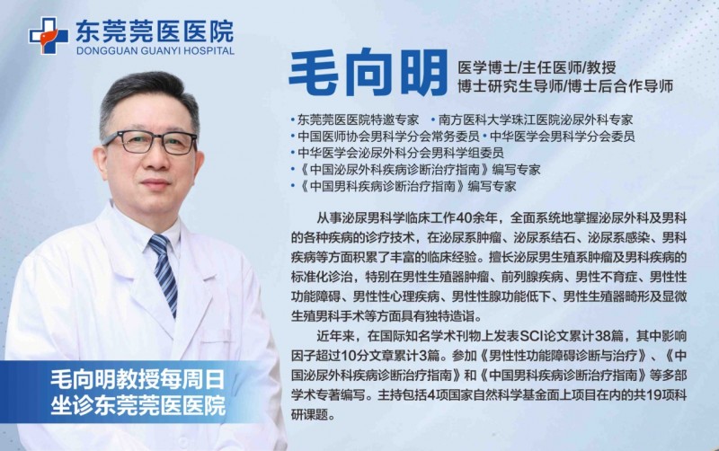 毛向明教授是南方医科大学珠江医院泌尿外科的资深专家,在男性性功能障碍(阳痿、早泄)、前列腺炎、前列腺增生、男性不育等泌尿男科疾病的诊断与治疗领域造诣深厚,临床经验丰富,在省内乃至全国享有盛誉。他的加盟,为东莞莞医医院泌尿男科注入了强大的技术力量。