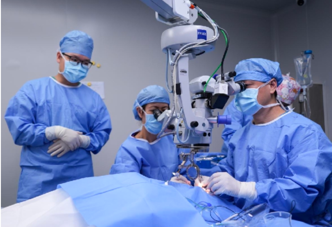 9月8日,由周世有与叶健章共同主刀“右眼穿透性角膜移植术、白内障摘除术”,李永浩携手眼底病科黄河华负责“右眼后入路玻璃体切割术”,同时同步开展“房角分离术”“玻璃体药物注射术”。手术贯穿眼球前、中、后段结构,涉及角膜、前房、虹膜、晶状体、玻璃体、视网膜等多个关键部位,对手术技巧和团队协作能力要求极高。最终,手术成功完成,为刘先生保住了眼球。
