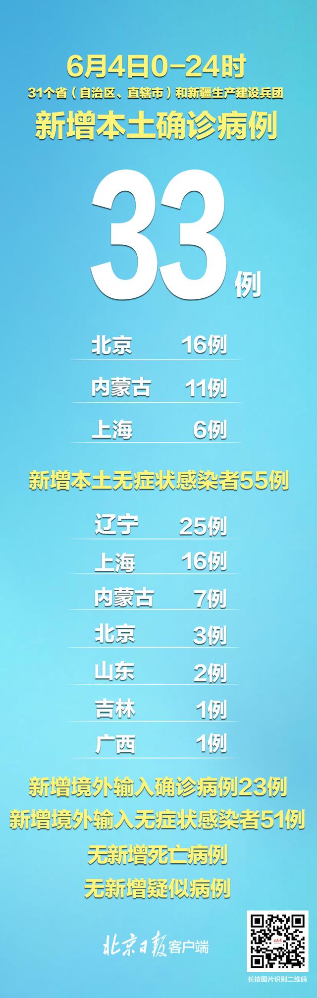 6月4日0—24时,31个省(自治区、直辖市)和新疆生产建设兵团报告新增确诊病例56例。其中境外输入病例23例(福建8例,四川5例,广东4例,北京1例,天津1例,上海1例,山东1例,广西1例,云南1例);本土病例33例(北京16例,内蒙古11例,上海6例),含3例由无症状感染者转为确诊病例(北京2例,上海1例)。无新增死亡病例。无新增疑似病例。