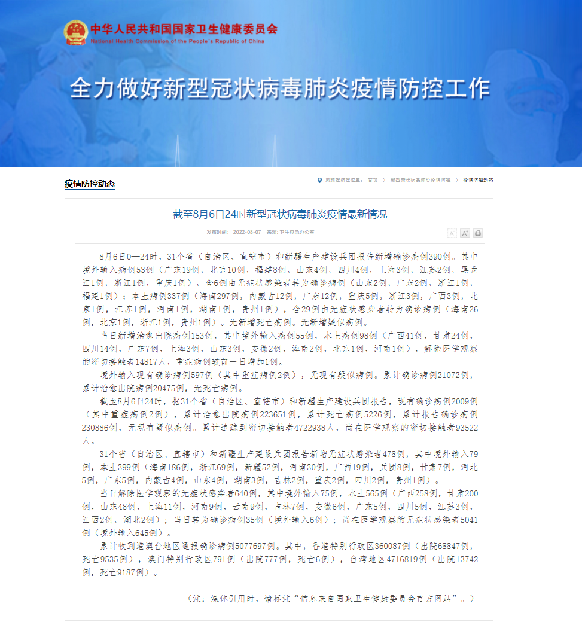 截至8月6日24时,据31个省(自治区、直辖市)和新疆生产建设兵团报告,现有确诊病例2009例(其中重症病例2例),累计治愈出院病例223651例,累计死亡病例5226例,累计报告确诊病例230886例,无现有疑似病例。累计追踪到密切接触者4722938人,尚在医学观察的密切接触者93522人。