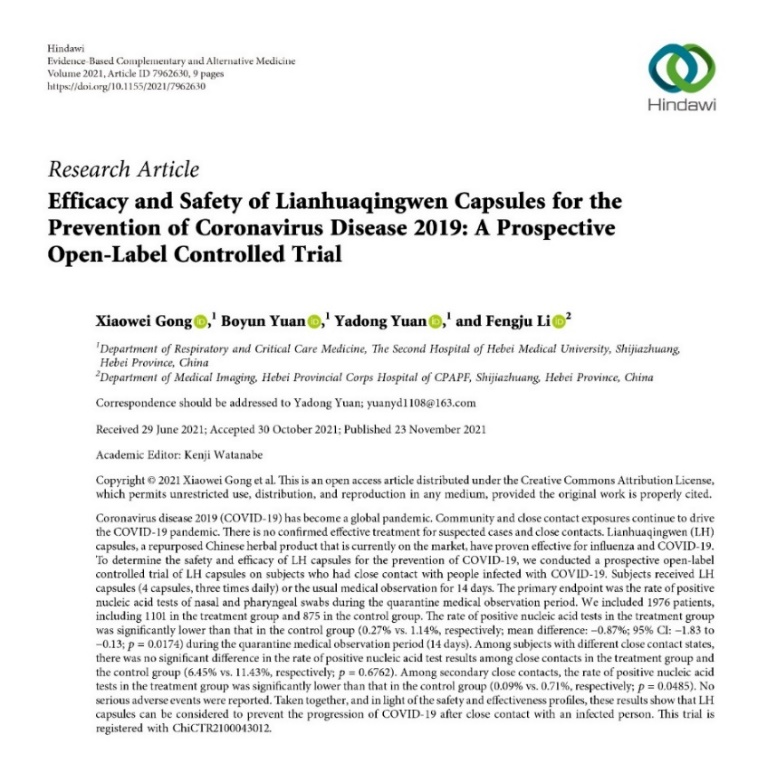 近期,国际学术期刊Evidence-based Complementary and Alternative Medicine刊发了一篇“连花清瘟胶囊预防新型冠状病毒肺炎”真实世界研究论文,这是中药对新冠密切接触者预防的临床试验。研究人员选取1976例与新冠肺炎感染者有密切接触的受试者,分为连花清瘟干预组(1101例)和对照组(875例)分别接受连花清瘟胶囊(一次4粒,一日3次)或常规医学观察14天,以医学隔离观察期间鼻咽拭子核酸检测阳性率作为主要评价指标。结果证明,连花清瘟干预组核酸检测阳性率显著低于对照组(0.27%vs.1.14%),密接人群预防应用连花清瘟可降低新冠肺炎阳性感染率达76%,同时具有良好的安全性。