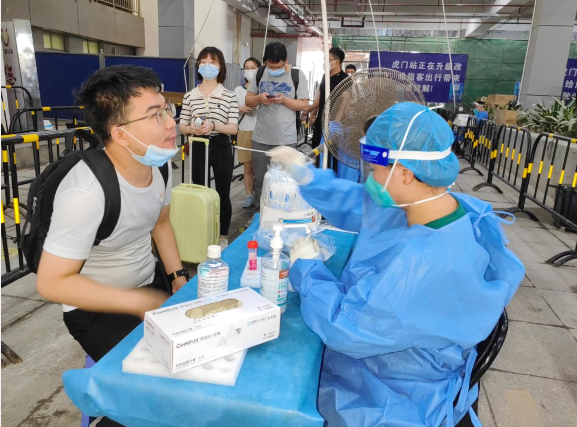 “从中秋节开始,虎门镇就在虎门高铁站开展‘落地检测’,凡是跨市到虎门下车的旅客,我们都建议现场进行核酸检测,从中秋节到现在,平均每天检测的到站旅客超过1.5万人次。”东莞市交通运输局虎门分局在高铁站疫情防控现场的负责人苏绍岳对记者说。