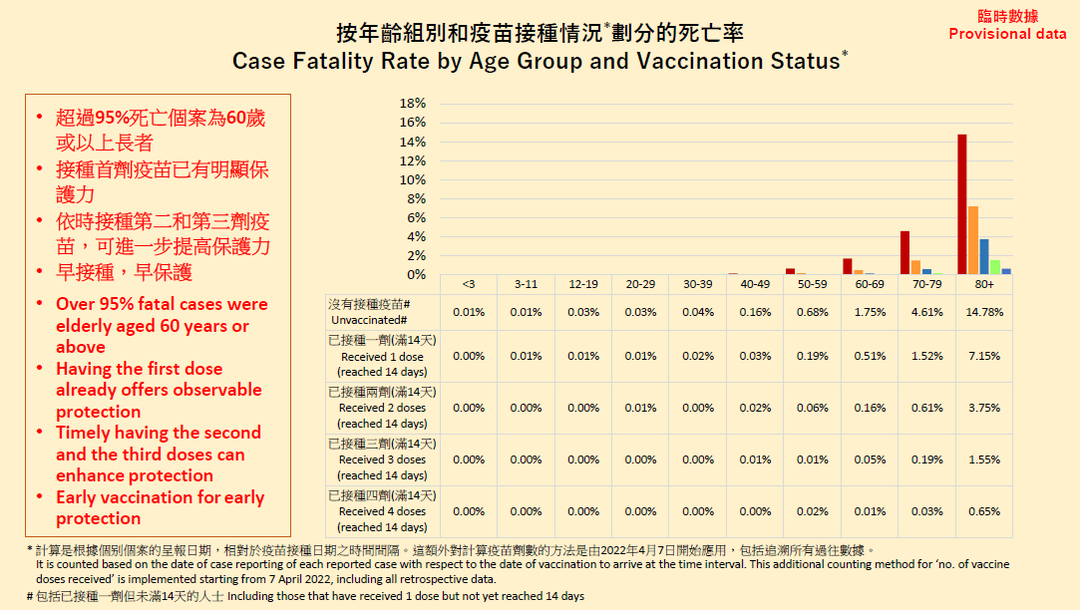 香港卫生署卫生防护中心第五波疫情监测数据(2021年12月31日至2022年11月9日)显示:接种任何三剂新冠病毒疫苗,老年人群死亡风险大幅减少,特别是较年长的年龄组别。
