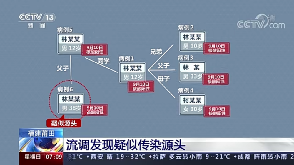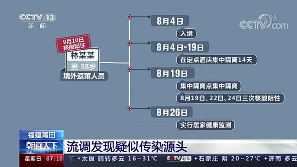 9月10日,福建莆田仙游县报告6名本土新冠肺炎阳性人员,流调发现,病例六(38岁林某某)为境外返莆人员,8月4日乘坐厦门航空852航班自新加坡从厦门机场入境,自机场定点酒店集中隔离14天后,于8月19日点对点转运至仙游县集中隔离点继续集中隔离。8月19日、22日、24日三次核酸检测均为阴性,8月26日起实行居家健康监测。经专家初步研判,病例六林某某很可能就是本次疫情传染链条的源头。