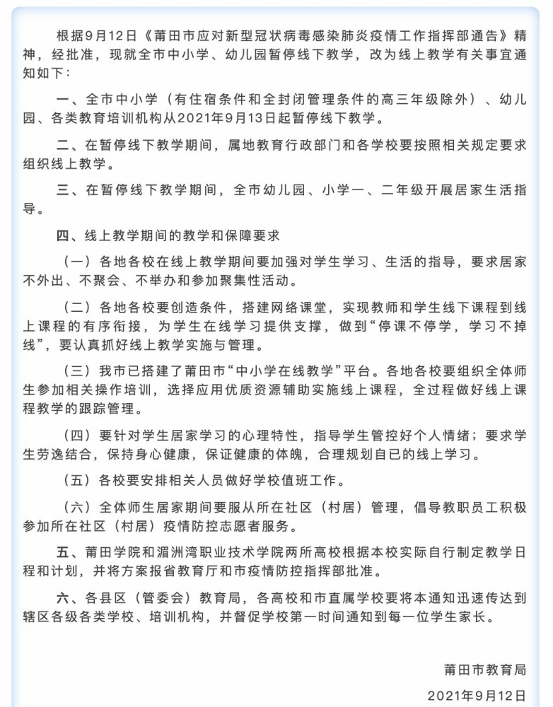 根据9月12日《莆田市应对新型冠状病毒感染肺炎疫情工作指挥部通告》精神,经批准,目前就莆田全市中小学、幼儿园暂停线下教学。