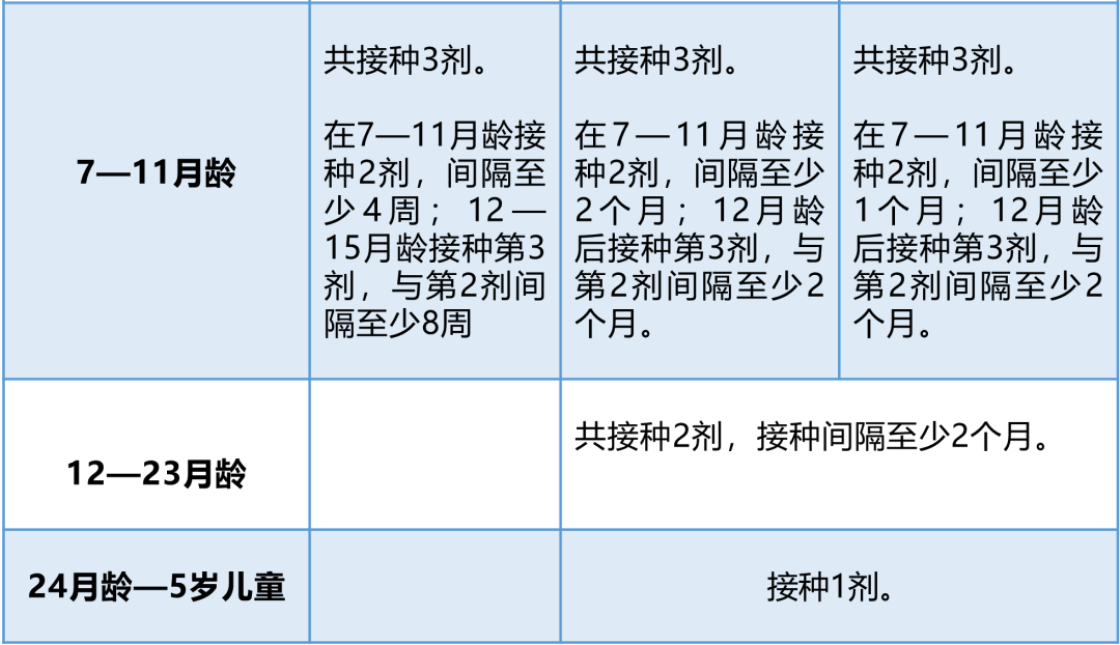 其实,这是由于接种第一针的年龄不同,孩子能够接种的剂次是不一样的呢。具体可以看下面的表格: