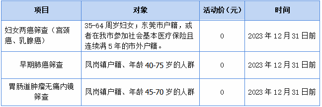 属于东莞市户籍,或者在东莞参加社会基本医疗保险且连续满5年的市外户籍,35-64周岁妇女,2023年内可到凤岗人民医院免费进行宫颈癌、乳腺癌两癌筛查。