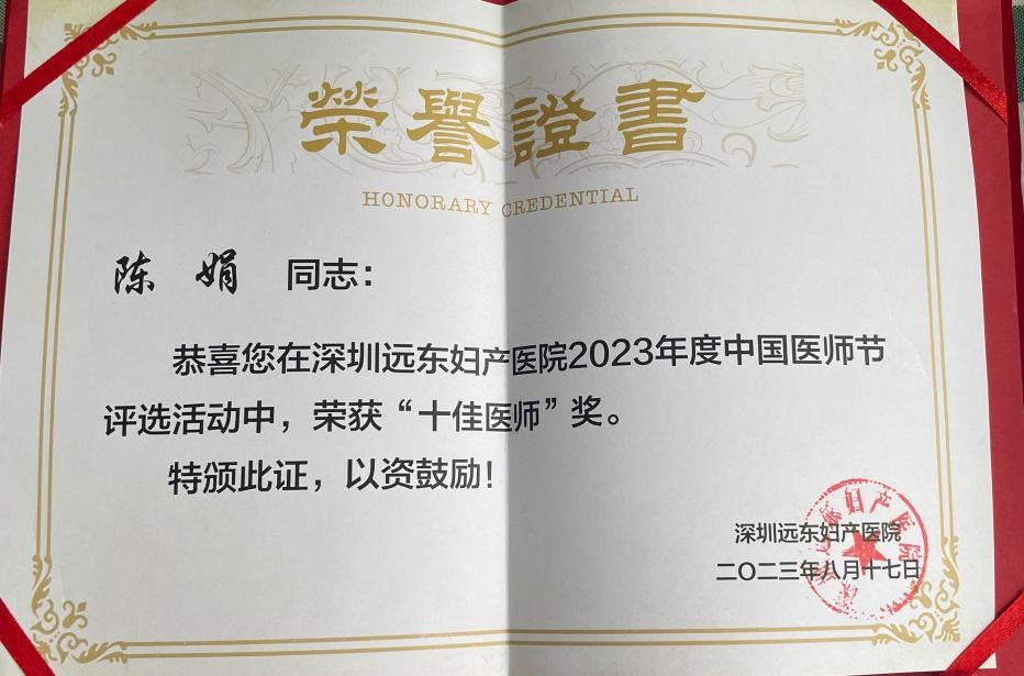 被授予“十佳医师”荣誉称号的口腔科陈娟医生