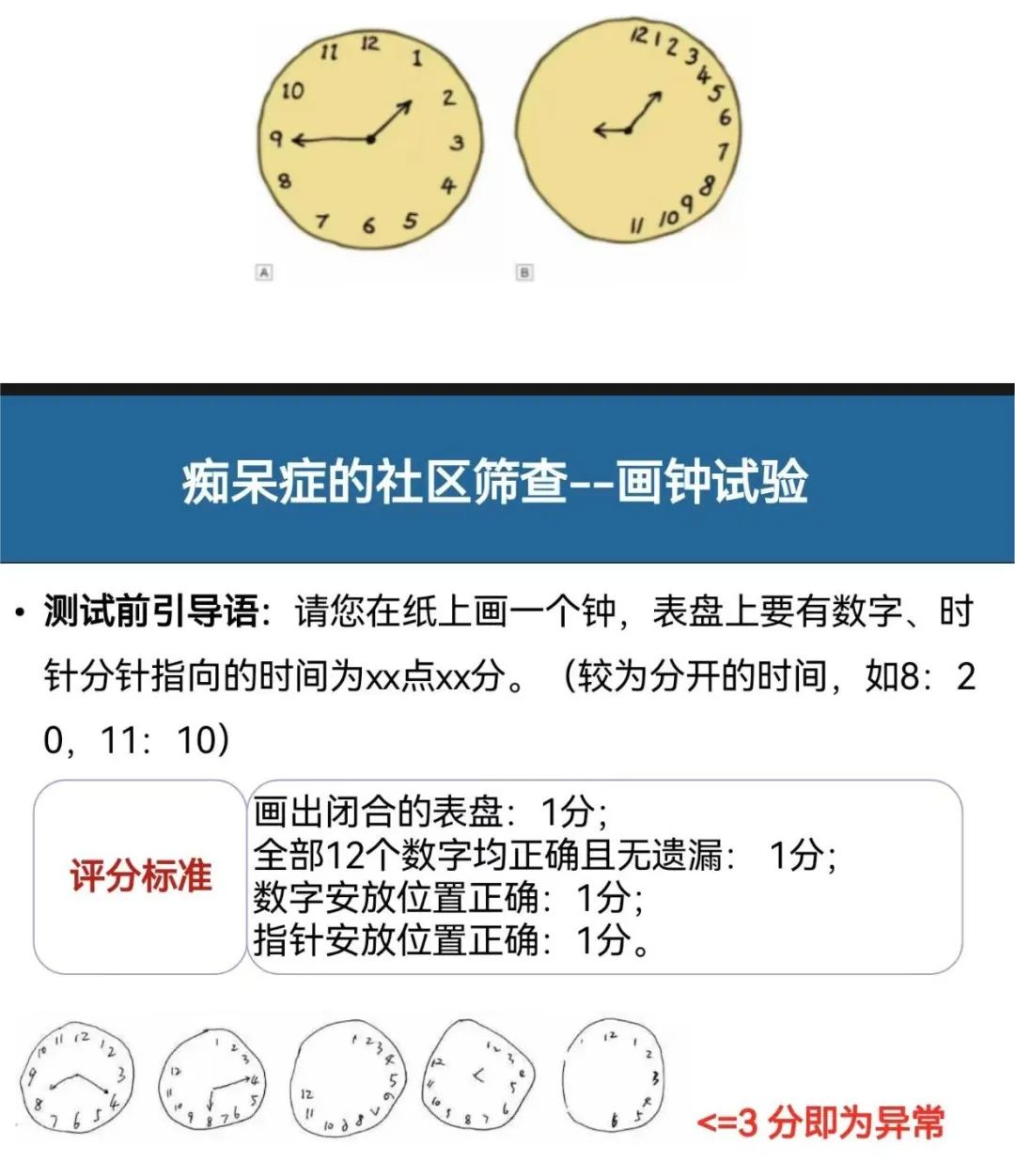测试者画出闭锁的圆形表盘,得1分;表盘上12个数字正确,得1分;时针分针相交,得1分;指针指向正确的时间,得1分。最终得分在0—2分者,可以判定为认知水平下降,需要找专业医生进行干预。(来源:东莞市卫生健康局)