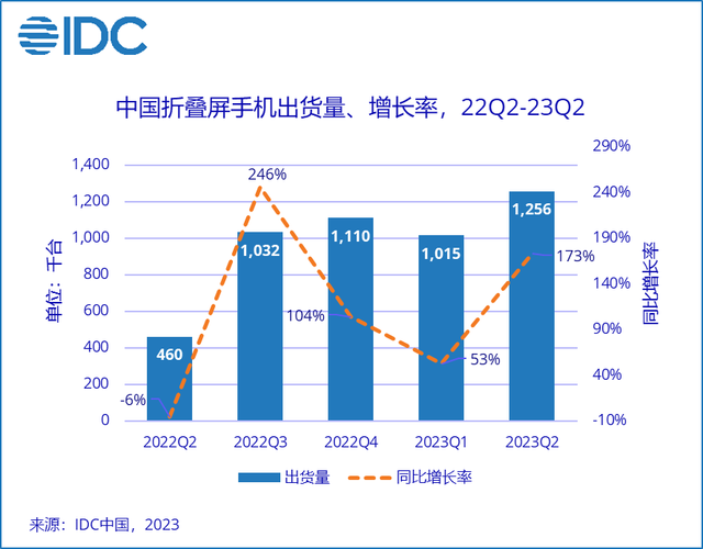 国际数据公司(IDC)手机季度跟踪报告显示,2023年第二季度,中国折叠屏手机市场出货量约126万台,同比增长173.0%;上半年出货227万台,同比增长102.0%。